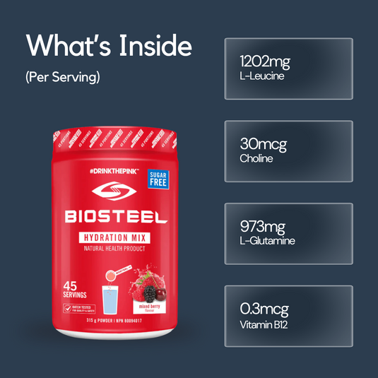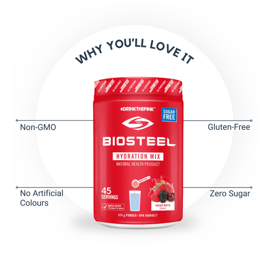 Biosteel Hydration Mix provides clean, natural hydration to keep you refreshed throughout the day. Made with zero sugar, no artificial flavors or colors, and quality ingredients, it’s a healthier way to stay hydrated. Packed with essential vitamins and minerals, it also supports overall health and immune function. Just mix it with water for a clean, convenient hydration solution.