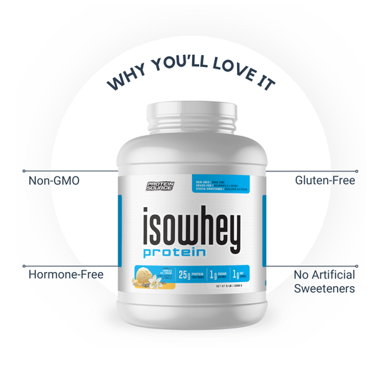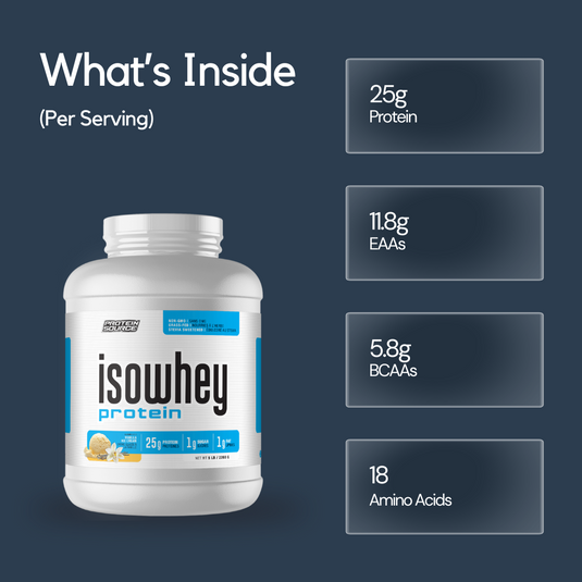 Introducing Protein Source Whey Isolate—your top choice for muscle-building, clean whey isolate protein. Each serving provides 25g of high-quality protein, just 1g of carbs, and 1g of sugar, all while delivering 18 essential amino acids to support muscle recovery and growth.