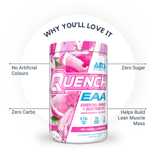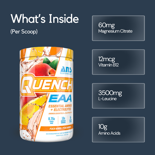 QUENCH EAA is a comprehensive blend of all 9 essential amino acids (EAAs) and a powerful hydration matrix to support muscle recovery and performance. Each scoop delivers 10g of total amino acids, including 8.75g of EAAs and 7g of muscle-building BCAAs. Enhanced with energizing B vitamins and vital electrolytes, QUENCH EAA helps fuel intense workouts while keeping you hydrated and primed for peak performance.